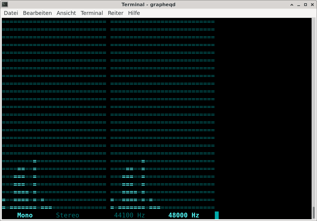 Back in the 80ies and 90ies hifis and stereos came with a graphical equalizer as a separate, physical device, or could be equipped with one. You don't easily find one of these nowadays, at least not for the consumer market. I have never found any use of actually adjusting the audio signal, but always liked the fluorescent dot matrix displays or LCDs. grapheqd tries to reassemble this.
