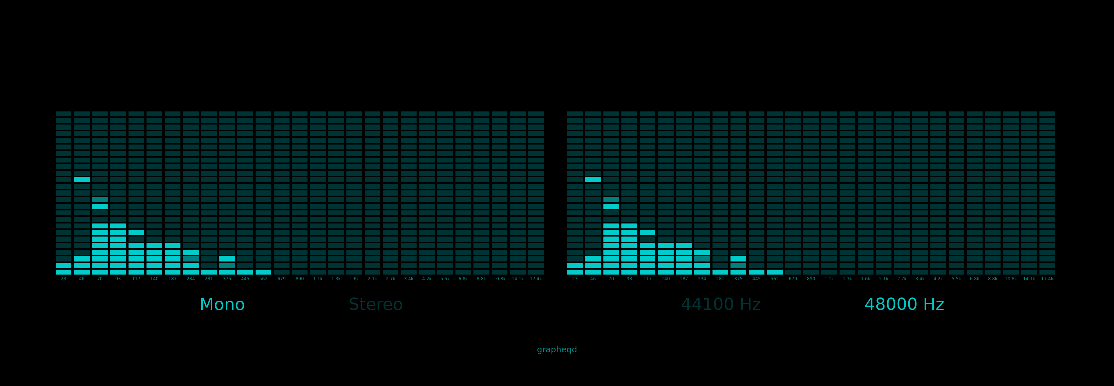 Per channel, grapheqd passes 4096 16 bit audio samples (mono or stereo) at a time to FFT, and pushes calculated linear frequency data to all connected clients, thus resulting in roughly 11 or 12 updates per second if your hardware supports sampling at 44100 or 48000 Hz, respectively. The web interface adjusts the labels under each band (vertical bar) to match its frequency range. If only mono audio is available, then the FFT is called just once per loop, while the output data is duplicated. If no client is connected, then no PCM data is read and FFT does not burn CPU cycles unnecessarily.
