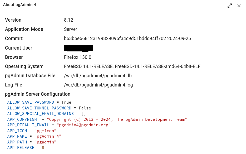 This describes how to install, configure, and run pgAdmin 4 8.1 8.11 8.12 on FreeBSD 14 using mod_wsgi and the Apache webserver. On FreeBSD 13, I was able to install pgAdmin 4 by simply executing pip install pgadmin4 (in a venv), but was not able to install any version greater than 6.21 using this simple method. This does not work for me on FreeBSD 14 at all. Thus, I used the pgAdmin 4 source code.