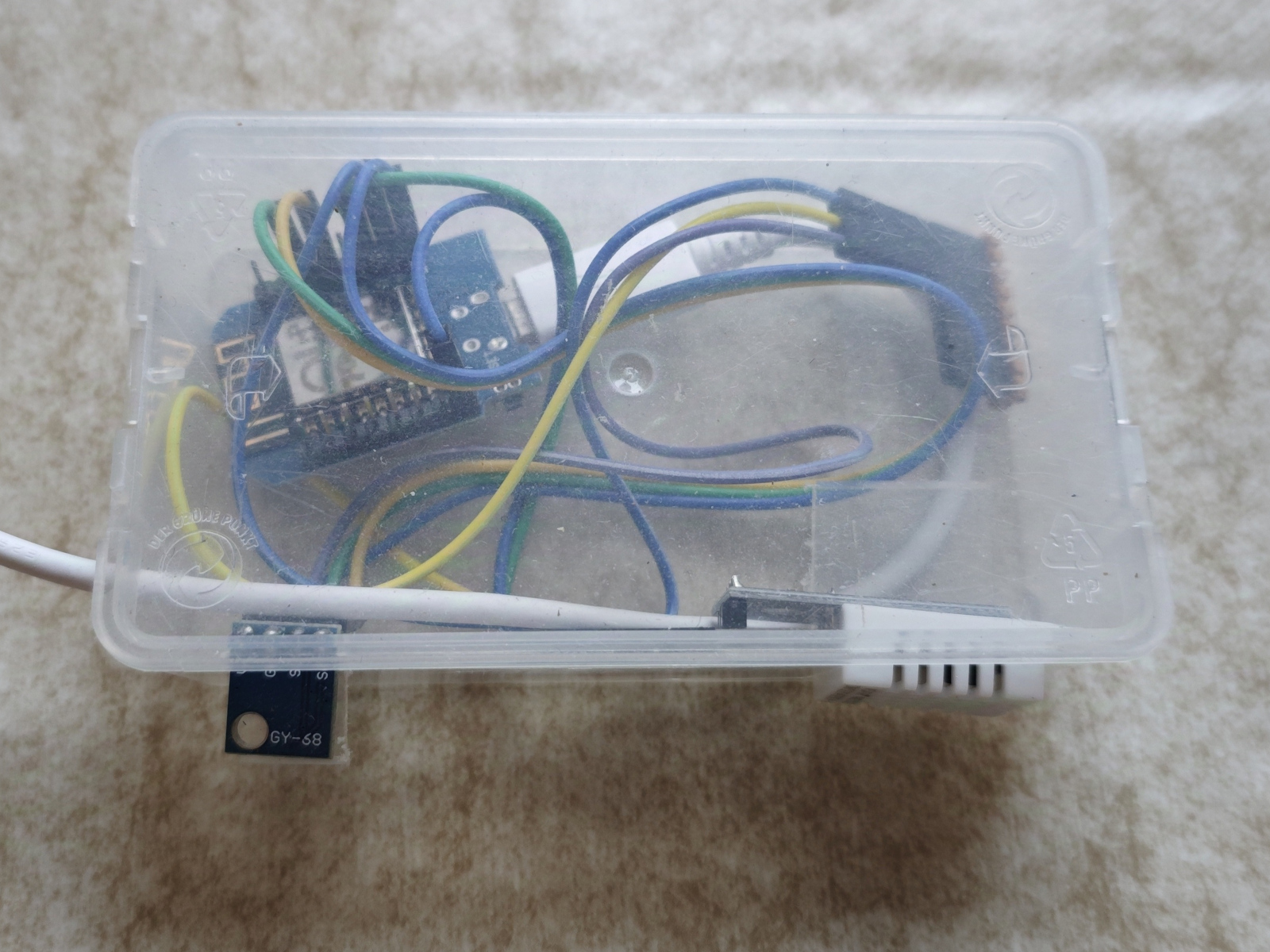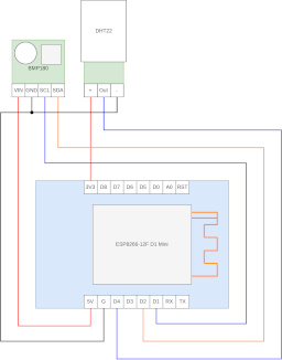 For a couple of years now I have been running selfmade environmental sensors based on ESP8266 microcontrollers. I use ESP8266-12F models which are already mounted on a small circuit board. To connect the actual sensors, I have soldered two pin headers to each circuit board. A DHT22 serves as temperature and humidity sensor, while a BMP180 provides barometric pressure and an additional temperature reading. Each microcontroller along with the two sensors and the cabling is placed into a small plastic box that you get at a household or a thrift store. The package is powered by either a mobile phone charger or an USB outlet on another device around the house, e.g. a WLAN access point or a power strip with USB sockets.