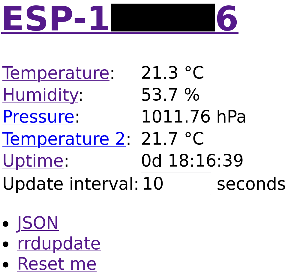 If you add /temperature, /humidity, /pressure, or /uptime to the URL, you will get each reading as a separate value, e.g. for further usage in a network monitoring system. Additionally, /json and /rrdupdate provide all readings in JSO format and suitable for rrdupdate, respectively.
